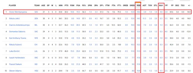 目前文班亚马在5场比赛场均得到30.2分14.6篮板3.4助攻1.4抢断4.8盖帽,投篮命中率56.3%,三分命中率31.3%,罚球命中率79.2%。他在得分榜上位居第九,篮板球和盖帽都排名联盟第一,5次两双也是排名第一。