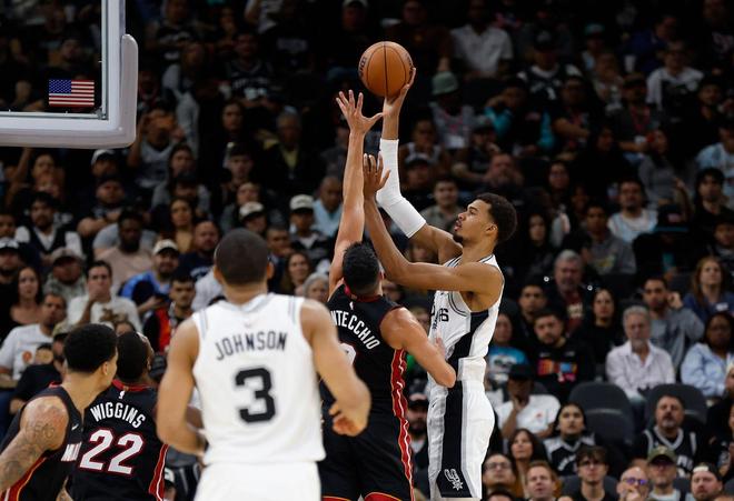 后场核心福克斯因伤缺席赛季初的比赛,但是文班亚马带领马刺打出了完美开局。上一场对阵猛龙,文班亚马竟然没有一次三分球出手。这一战对阵热火,文班亚马5次出手三分球。值得一提的是,文班亚马在菜鸟赛季场均出手三分球5.5次,而在上赛季场均出手三分球8.8次。